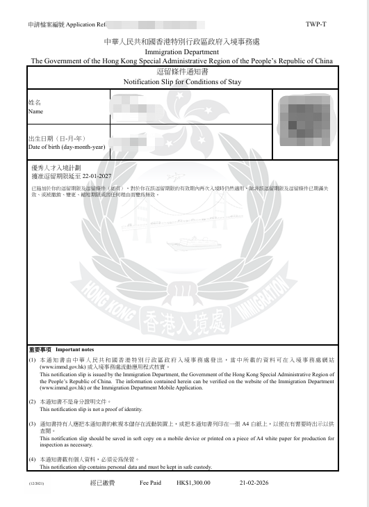 H先生在香港优才签证到期前找到我们为其办理续签,我们于2026年2月21日为H先生优才续签成功!