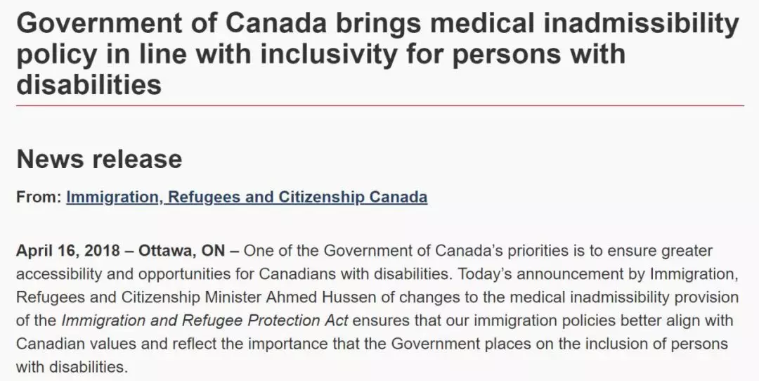 本周一(4月16日),加拿大移民部长胡森(Ahmed Hussen)宣布,对移民申请人体检要求作出修改,今后,智力发育延缓、需要特殊教育服务、听力或视力障碍的移民申请人,将不再被拒绝移民。也就是说,加拿大政府放宽了移民体检要求,对带有缺陷的或障碍的申请人将更加包容和开放!