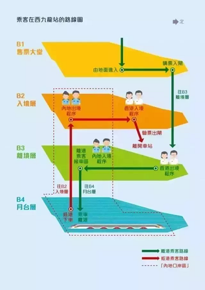 比如,从内地出发的旅客在上车前无需办理出境手续,在香港西九龙站下车后,要先办理出境内地程序离开内地口岸区,再进入同一层的香港口岸区,办理入境香港程序,然后出站。