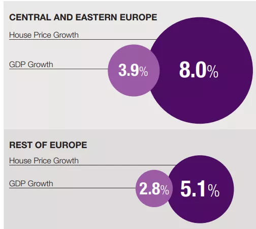 中欧和东欧国家表现抢眼,目前正在成为房价强劲增长的区域。截至2018年6月,拉脱维亚、斯洛文尼亚和匈牙利的房价分别上涨了13.7%、13.4%、12.2%。整个中欧和东欧地区房价的平均增长率为8%,欧洲其他地区房价增长率则为5.1%。