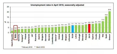 2018年4月,马耳他失业率再创新低,仅为3%,赶超德国,位列欧洲失业率最低国家排行榜第二位,远低于欧盟平均失业率和欧元区平均失业率。目前,马耳他失业人口仅为1800人,常年失业人数仅为0.9%。